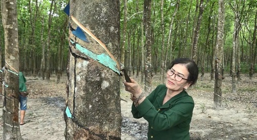 Bà Phạm Thị Kim Sa, Tổ 6, khu phố Phú Lộc đang cạo mủ cao su
